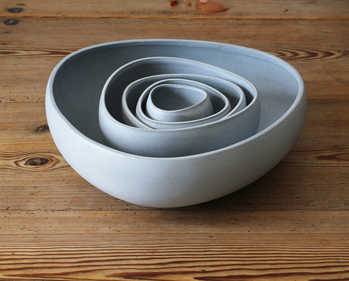 Ceramic series of six bowls and one tray in stoneware.